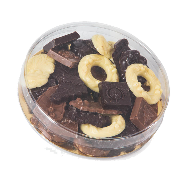 - Smaken en verdeling: wit, melk en puur (mix van kerstvormen en -motieven)