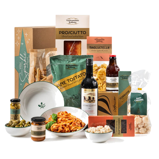 Waarom dit pakket kiezen? Het is een complete beleving in één doos: servies voor een feestelijke tafel, uitstekende producten voor een Italiaans diner en zorgvuldig geselecteerde zoetigheden en dranken voor het perfecte einde. Ideaal als kerstcadeau, relatiegeschenk of om samen van te genieten tijdens een intieme avond. Bestel nu en geef een smaakvol cadeau dat indruk maakt.