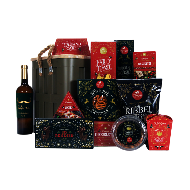 Het kerstpakket is gevuld met heerlijke Rudolph-specialiteiten: een thee selectie met drie smaken, een charmant 3D cacao rendier, zachte fudge, knapperige cookies, een luchtige tulband cake duo choco vanille, ribbelchips gezouten, romige brie, zoete en zoute honey roasted peanuts en krokante party toast. Een geschenk dat smaak, stijl en functionaliteit moeiteloos combineert.