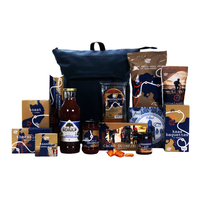 Dit pakket zit boordevol Wind Mee-specialiteiten: halva vruchtenjam aardbei, verfijnde thee selectie met drie smaken, ambachtelijke stroopwafels, romige cacao duimpjes, pittige sweet chili corn chips, zachte smeer & dipkaas, knapperige borrelnoten, krokante toast naturel, hartige borrelworst, smaakvolle Goudse kaas baguettes en een frisse cranberry dip. Inclusief feestelijke Holland Style servetten.