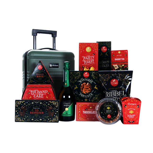 Dit kerstpakket combineert feestelijke bubbels met een stijlvol reiselement. De Tor dell'Elmo Prosecco DOC zorgt voor een frisse en elegante toost, terwijl de Norländer 24L cabin trolley in groen praktisch is voor zowel werkreizen als weekendjes weg.