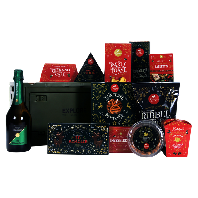 Het pakket is rijk gevuld met heerlijke Rudolph-producten: een thee selectie met drie smaken, een charmant 3D cacao rendier, zachte fudge, knapperige cookies, een luchtige tulband cake duo choco vanille, ribbelchips gezouten, romige brie, zoete en zoute honey roasted peanuts en krokante party toast. Een kerstpakket dat feestelijke smaken en praktische luxe samenbrengt.