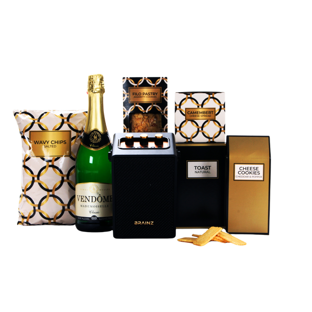 Combineer het feestelijke drankje met romige camembert spread (125 g), knapperige toast (100 g), hartige kaaskoekjes met cheddar en peper (57,5 g), krokante ribbelchips zout (90 g) en verfijnde filo pastry koekjes met amaretto (50 g).