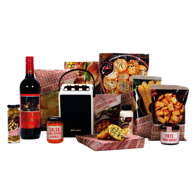 Dit kerstpakket bevat een rijk aanbod Delicias de Tapas-specialiteiten: romige aioli, hartige borrelnoten paprika, krokante geroosterde broodjes knoflook & peterselie, knapperige kaasstengels, smaakvolle olijven, verfijnde paté Pedro Ximénez, ribbelchips zout, pittige salsa chili, peper en knoflook, premium Serrano ham, feestelijke servetten en hartige snack bites tomaat. Een feestelijke combinatie van smaak, muziek en warmte.