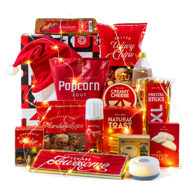 - Compleet en feestelijk: zowel snacks als sfeerverlichting en een kerstmuts