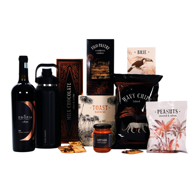 Dit kerstpakket bevat smaakvolle producten van Nature’s Paradise: romige brie (125 g), verfijnde filo pastry koekjes met cranberry (80 g) en hartige gezouten pinda’s (100 g). Voor de zoetekauw is er een royale melkchocoladereep XXL met rozijnen en pinda (225 g). Daarnaast zorgen de ribbelchips zout (90 g) en toast (100 g) voor de perfecte borrelbasis, met als smaakvolle toevoeging de zoete peper tapenade (130 g).