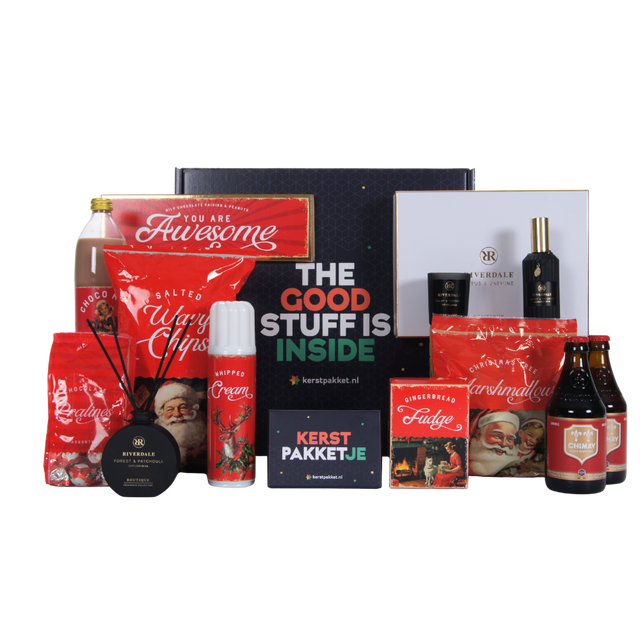 Laat je verwennen door Vintage Christmas bonbons in kerstmanvorm (100 g), romige chocomelk (500 ml) en zachte marshmallows in boompjesvorm (125 g). De fudge speculaas (110 g) en de royale melkchocoladereep XXL met rozijnen en pinda (225 g) zorgen voor ultieme zoetigheid, terwijl de ribbelchips zout (150 g) voor een hartige tegenhanger zorgen. Een spuitbus slagroom (250 g) maakt warme dranken en desserts extra feestelijk.
