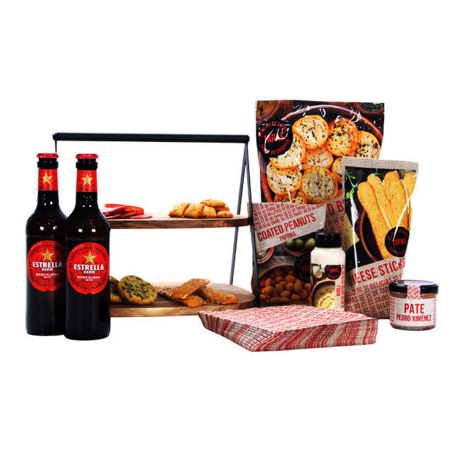 Het kerstpakket is gevuld met smaakvolle Delicias de Tapas-specialiteiten: romige aioli, hartige borrelnoten paprika, krokante geroosterde broodjes knoflook & peterselie, knapperige kaasstengels, verfijnde paté Pedro Ximénez en feestelijke servetten. Een geschenk dat Spaanse gezelligheid en stijlvolle presentatie combineert.