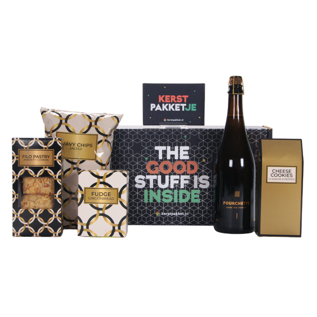 Dit kerstpakket bevat een selectie van Style de Luxe lekkernijen: delicate Filo Pastry koekjes Amaretti (50 g), romige fudge speculaas (110 g), smaakvolle kaaskoekjes cheddar en peper (57,5 g) en knapperige ribbelchips zout (90 g). Een perfecte mix van zoet en hartig voor ieder genietmoment.
