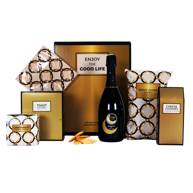 Geniet van romige Style de Luxe Camembert Spread (125 g), knapperige Kaaskoekjes Cheddar & Peper (57,5 g), goudgele Ribbelchips Zout (90 g), stijlvolle Servetten (20 stuks) en krokante Toast (100 g).