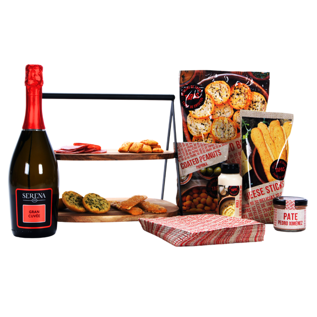 Dit kerstpakket bevat smaakvolle Delicias de Tapas-specialiteiten: romige aioli, hartige borrelnoten paprika, krokante geroosterde broodjes knoflook & peterselie, knapperige kaasstengels, verfijnde paté Pedro Ximénez en feestelijke servetten. Een combinatie van sprankeling, stijl en bourgondisch genieten.