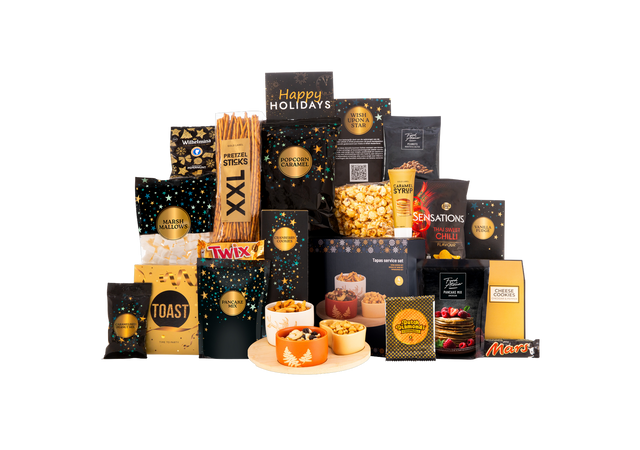 Of je nu op zoek bent naar iets om onder de kerstboom te leggen of een attentie voor op kantoor: dit cadeaupakket biedt voor ieder wat wils. Van knapperige chips en smeuïge stroopwafels tot chocoladeklassiekers en verfrissende frisdrankjes. Alles is stijlvol verpakt in een feestelijke geschenkdoos met een vrolijke Happy Holidays kaart, zodat je geen extra verpakkingswerk meer hebt.