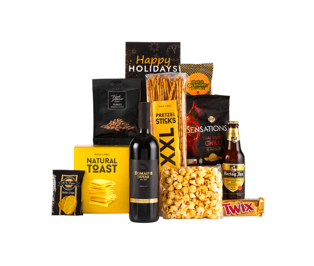 Verras iemand met het ultieme feestpakket: een sfeervol samengestelde cadeaubox vol luxe lekkernijen en een heerlijke rode wijn. Perfect als kerstgeschenk, relatiegeschenk of om een speciale gelegenheid te markeren. De stijlvolle doos straalt kwaliteit uit en is direct klaar om te geven, compleet met een warme felicitatietekst. Dit pakket combineert fijne hartige snacks, zoete verwennerijen en een verfijnde fles wijn voor een complete beleving.
