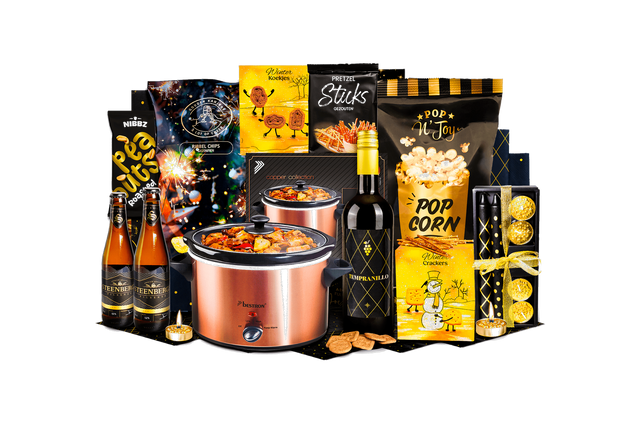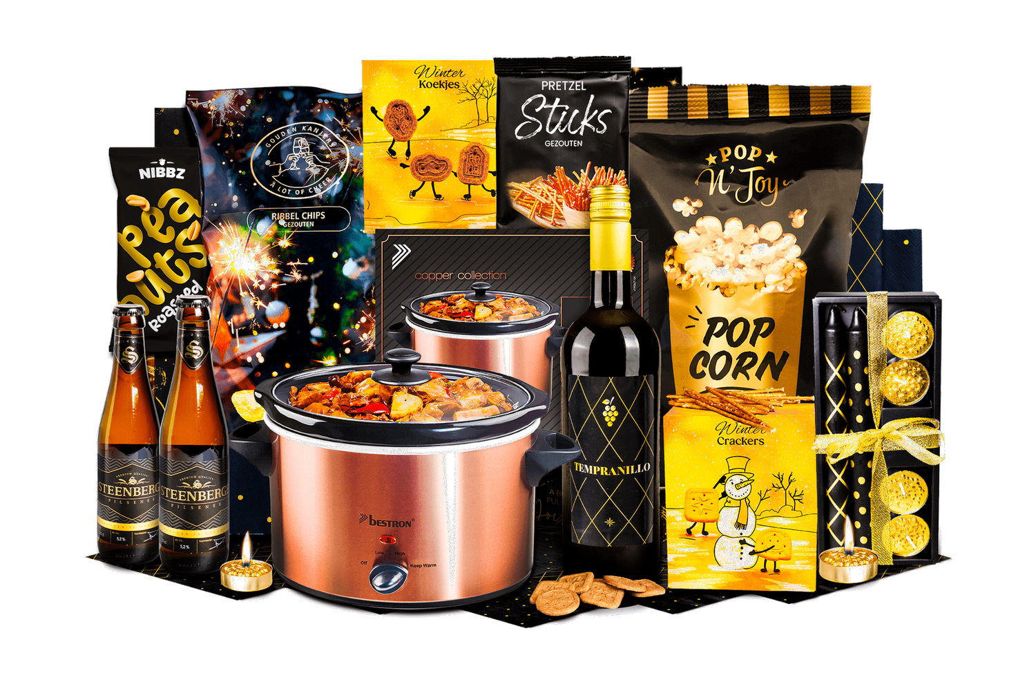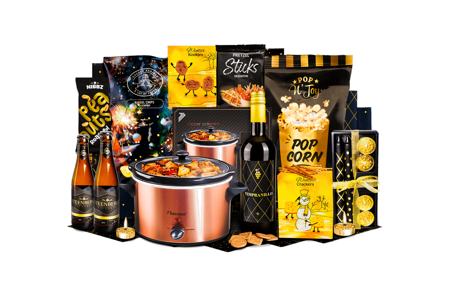Slowcooker in koper. Kook langzaam en smaakvol voor familie en vrienden met deze compacte 1,5 l slowcooker van 120 Watt. Dit feestelijke pakket bevat hapjes en dranken en is direct klaar om te geven.