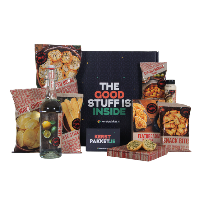Deze feestelijke box bevat een fles Delicias de Tapas sparkling limonade citroen/limoen (750 ml) – heerlijk fris, bruisend en perfect om te combineren met een hartige borrel.