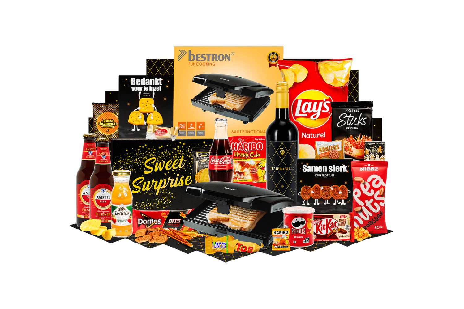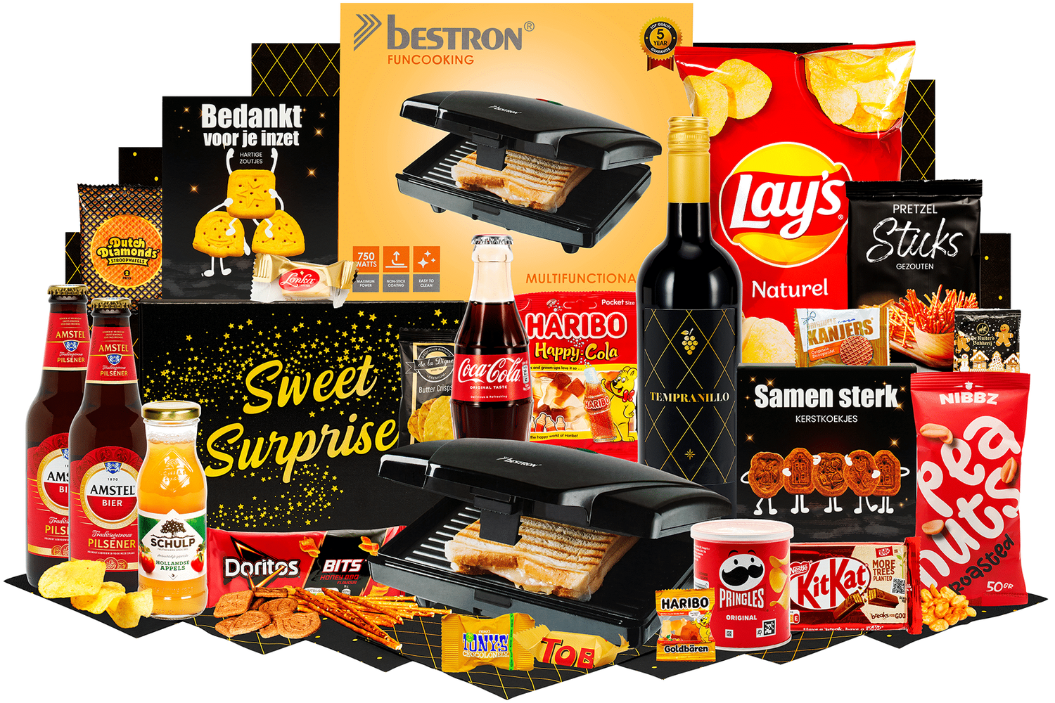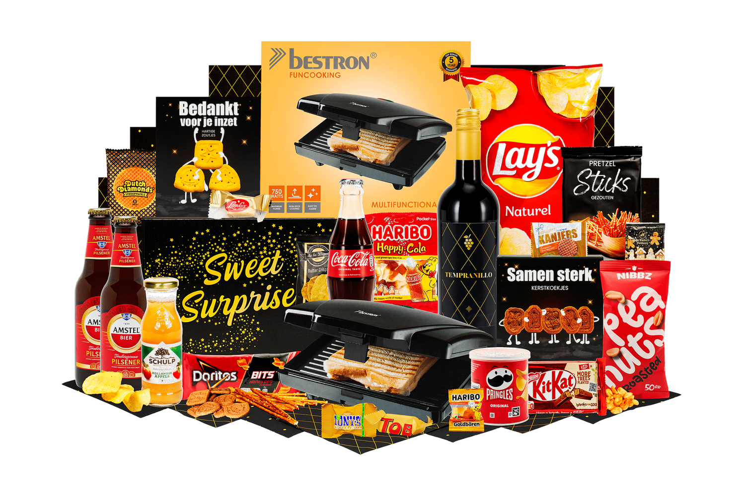 Tosti met een twist. Een complete box voor een gezellige snack- of borrelavond. Inclusief sandwich maker en een uitgebalanceerde mix van hartig, zoet en drank.