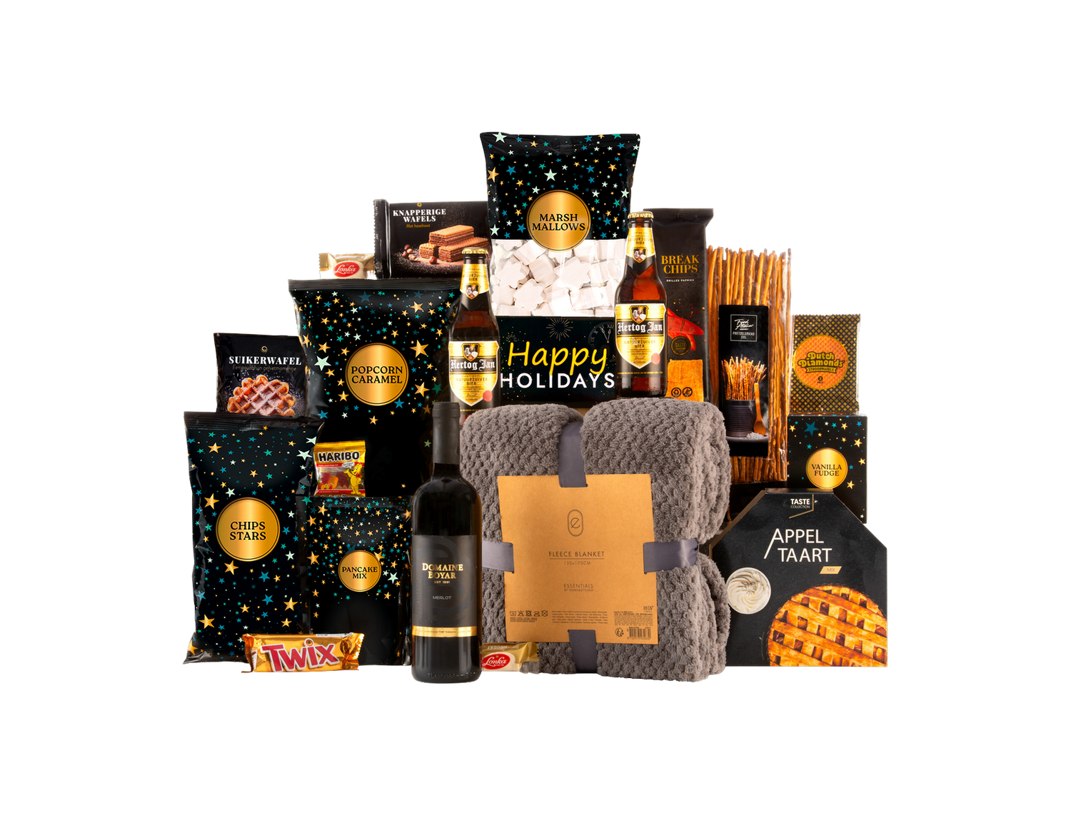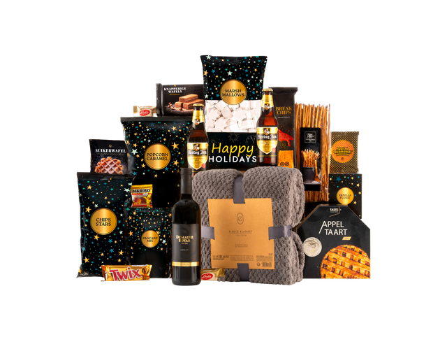De box bevat een luxe fleece deken om knusse momenten mee te creëren, een heerlijke fles rode wijn om samen van te genieten en een gevarieerde selectie van zoete en hartige snacks. Iedere smaak komt aan bod: van knapperige chips en zoute pretzels tot zachte nougat en smeuïge fudge. Kleine extra’s zoals een vrolijke kerstkaart maken het totaalplaatje compleet en persoonlijk.