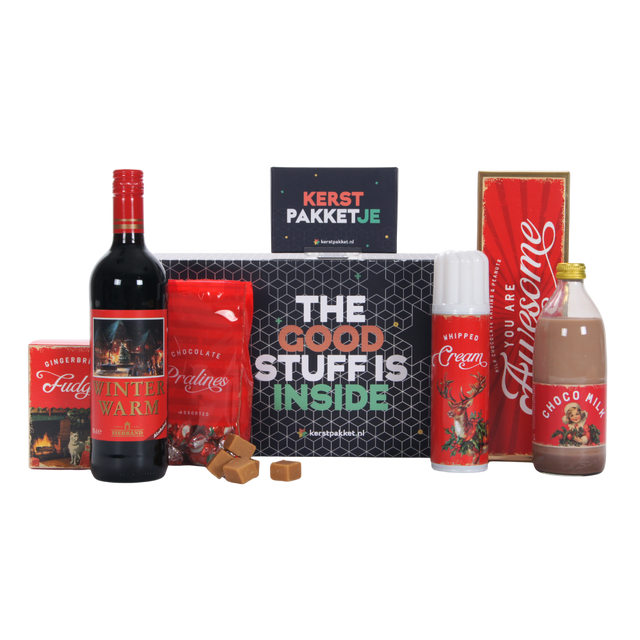 Dit kerstpakket bevat een heerlijke selectie Vintage Christmas bonbons kerstman assorti gevuld (100 g), romige chocomelk (500 ml), winterse fudge speculaas (110 g), een royale melkchocoladereep XXL met rozijnen en pinda (225 g) en luchtige slagroom (250 g) voor een feestelijke finishing touch.