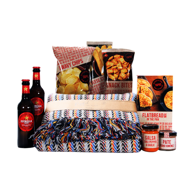 Dit kerstpakket is gevuld met smakelijke Delicias de Tapas-specialiteiten: flatbread mix in de pan, knapperige kaasstengels, verfijnde paté Pedro Ximénez, krokante ribbelchips zout, pittige salsa chili, peper en knoflook, en hartige snack bites tomaat. Een combinatie van Spaanse smaken en gezellig comfort.