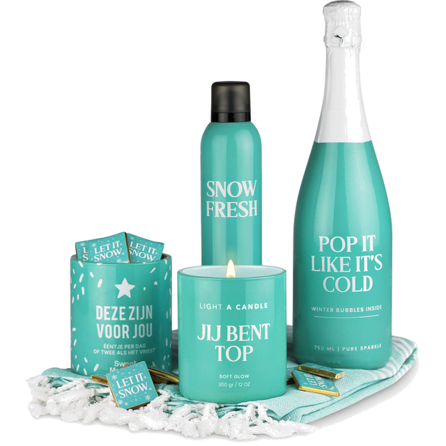 Verras iemand in winterse sferen met The Wellness Gift Jij bent Top – Winter Edition. Dit luxe pakket bevat een verfrissende showergel, een stijlvolle kaars, een snoeppot gevuld met heerlijke napolitain chocolade, een zachte hammamdoek en een frisse, fruitige Cava. Alles voor een moment van ontspanning én feestelijkheid.