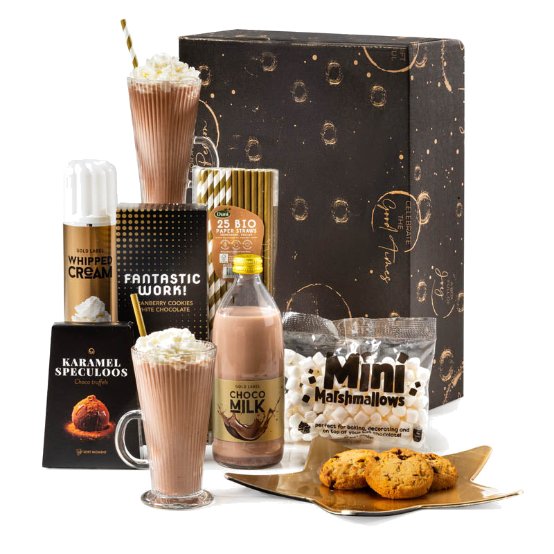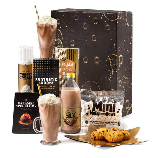 De uitstraling is elegant en feestelijk, met een goudkleurig stervormig serveerbord en twee stevige glazen op voet voor een sfeervolle presentatie. De inhoud is met zorg geselecteerd: romige chocomelk en luchtige slagroom voor de perfecte warme drank, knapperige koekjes en zachte marshmallows om te delen, en verfijnde truffels als luxe finishing touch. Alles wordt netjes gepresenteerd in een bijpassende geschenkdoos, klaar om te geven.
