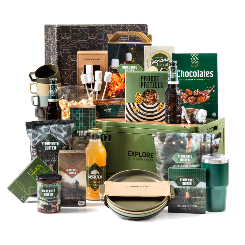 Waarom dit pakket zo geliefd is: het combineert functionele accessoires zoals stapelbare bekers, borden en een vacuümbeker met sfeervolle extras zoals een LED-zaklamp en marshmallows voor de BBQ. Daarnaast bevat het pakket een royale selectie aan snacks en dranken, van hartige kaasstengels tot zoete bonbons en een mix voor bananenbrood. Ideaal als cadeau voor vrienden, collega’s of familie die graag buiten zijn of van gezellige momenten houden.