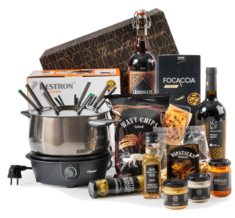 Beleef heerlijke avonden samen met het luxe fondue kerstpakket: een stijlvol en smaakvol cadeau dat direct uitnodigt tot gezelligheid. De titaan-kleurige elektrische fonduepan zorgt voor een warme, sfeervolle tafel en biedt gebruiksgemak voor urenlang fonduen. Rond de pan een selectie van verfijnde dips, knapperig brood en hartige snacks en een uitstekende Italiaanse rode wijn maken dit pakket tot het perfecte eindejaarsgeschenk voor fijnproevers.