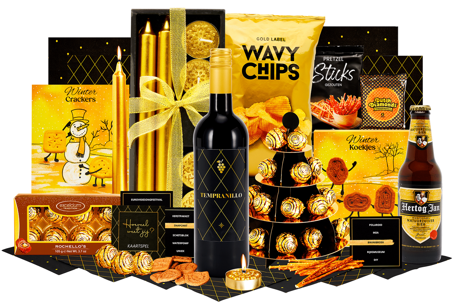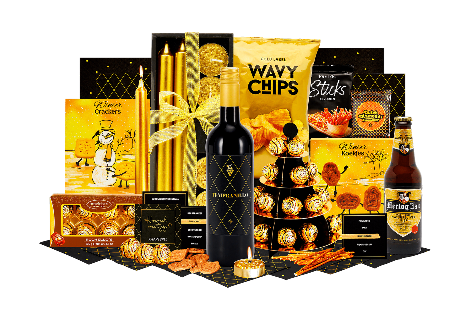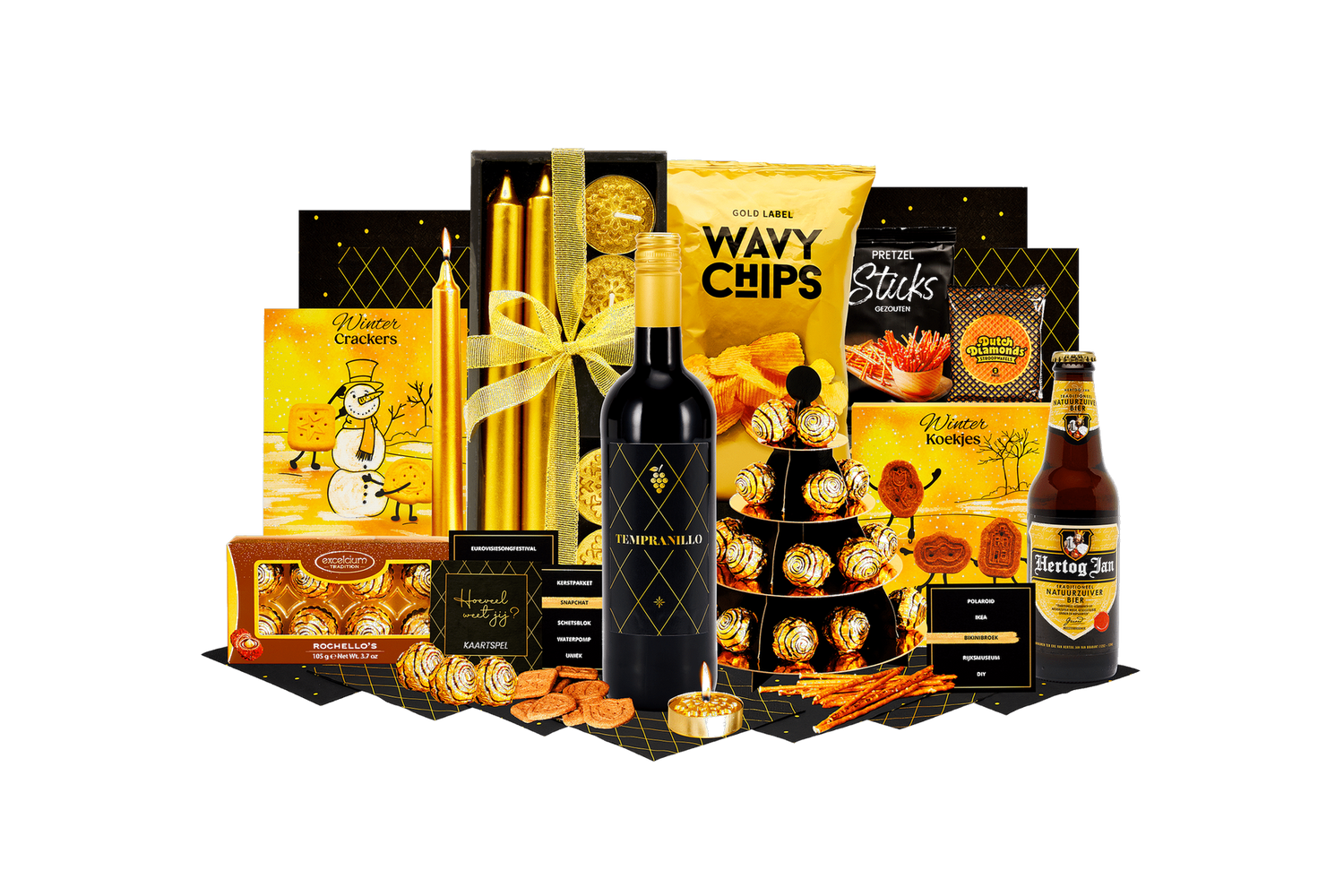 Feest van goud. Luxe cadeaubox met een feestelijke mix van lekkernijen en sfeervolle accessoires. Klaar om direct te geven en perfect voor warme, feestelijke momenten.