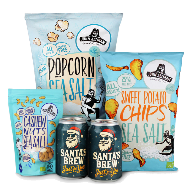 Inhoud: 5 artikelen; 2x Santa's Brew Pilsener - 33cl; 1x John Altman Bio Organic Seasalt Popcorn 60gr; 1x John Altman Vegan Sweet Potato Sea Salt 90gr; 1x John Altman Vegan Dry Roasted Cashew Nuts Sea Salt 100g; 1x Luxe geschenkverpakking