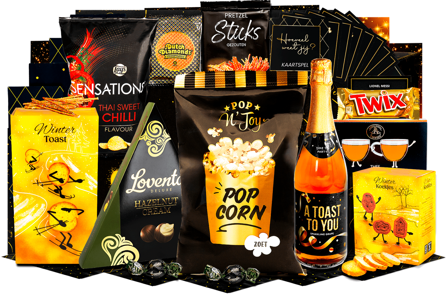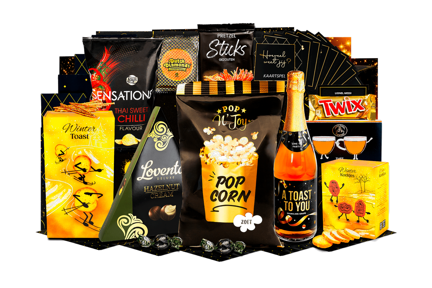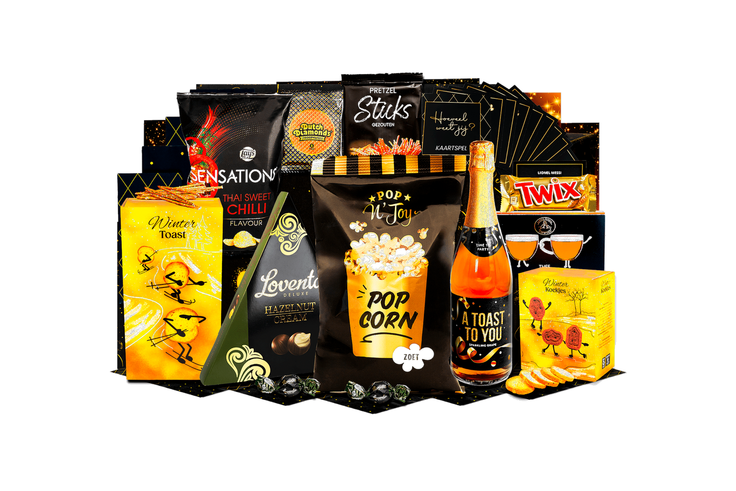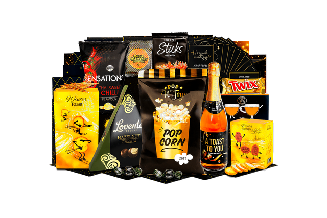 Genietmoment deluxe. Een zorgvuldig samengestelde box vol smaak en gezelligheid. Perfect om cadeau te geven of samen van te genieten tijdens feestelijke momenten.
