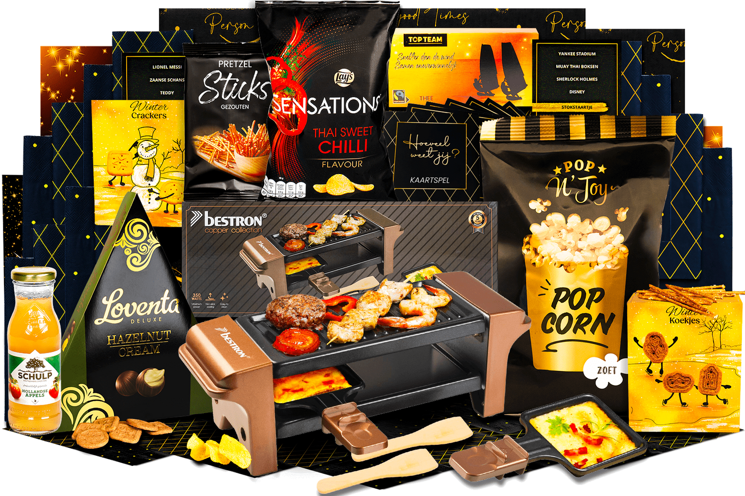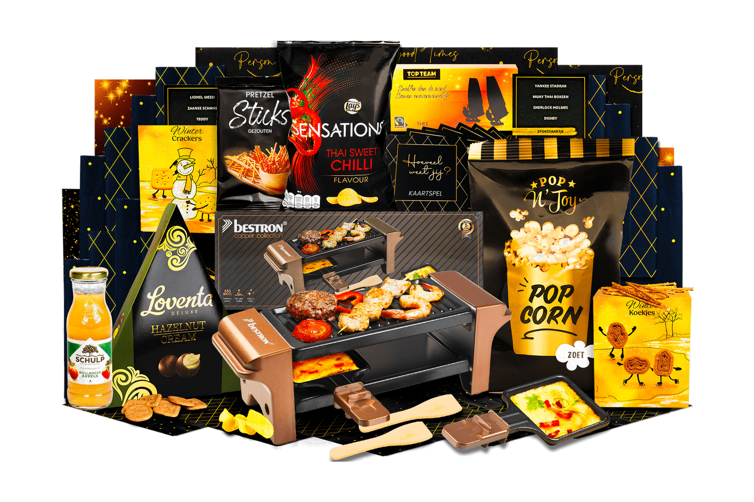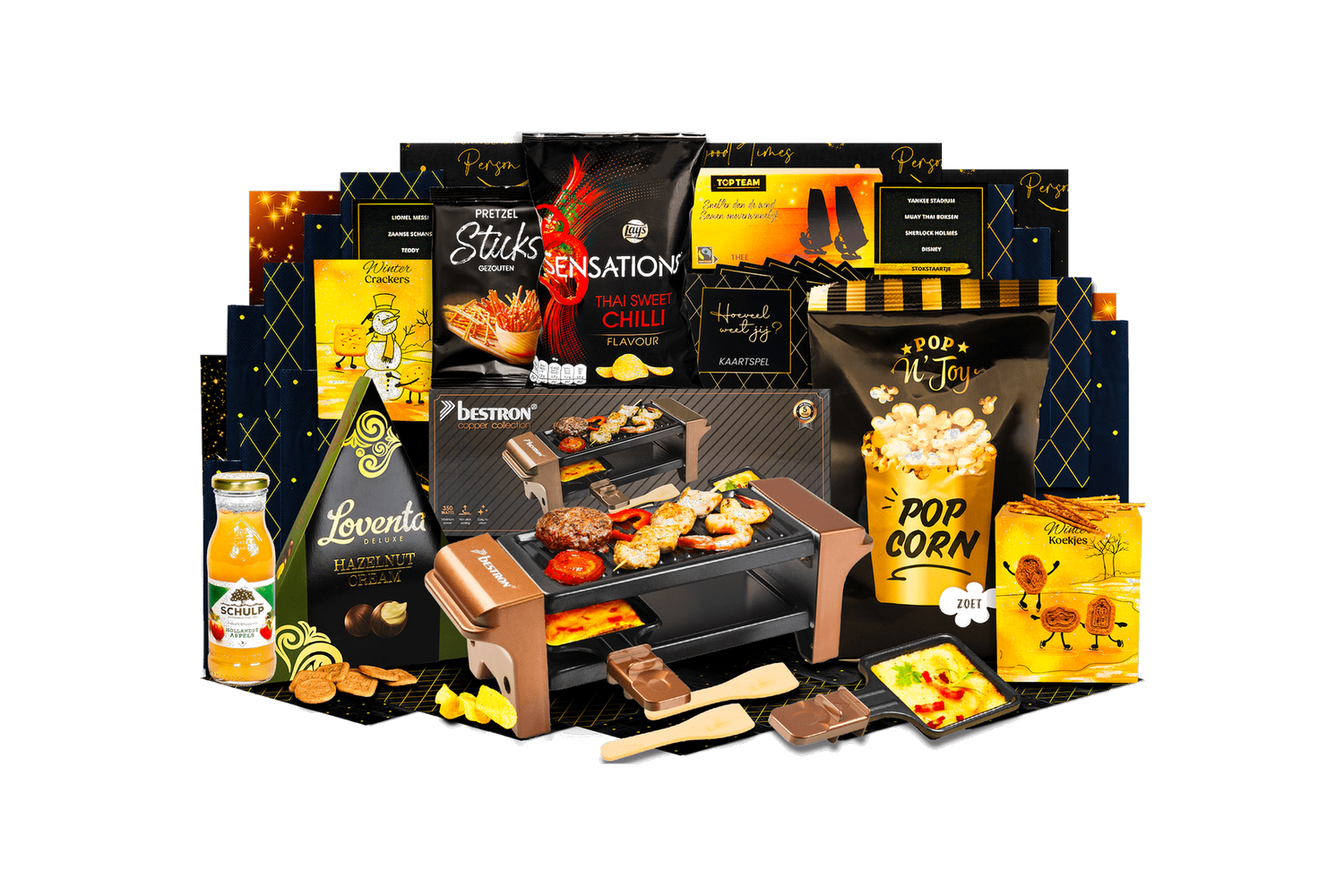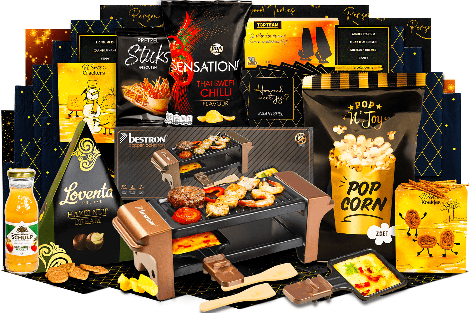 Gezellig racletten is de complete set voor een sfeervolle avond met z'n tweeën. Alles wat je nodig hebt voor raclette en lekkere versnaperingen zit erbij. Wordt geleverd in een feestelijke kerstdoos, klaar om cadeau te geven.