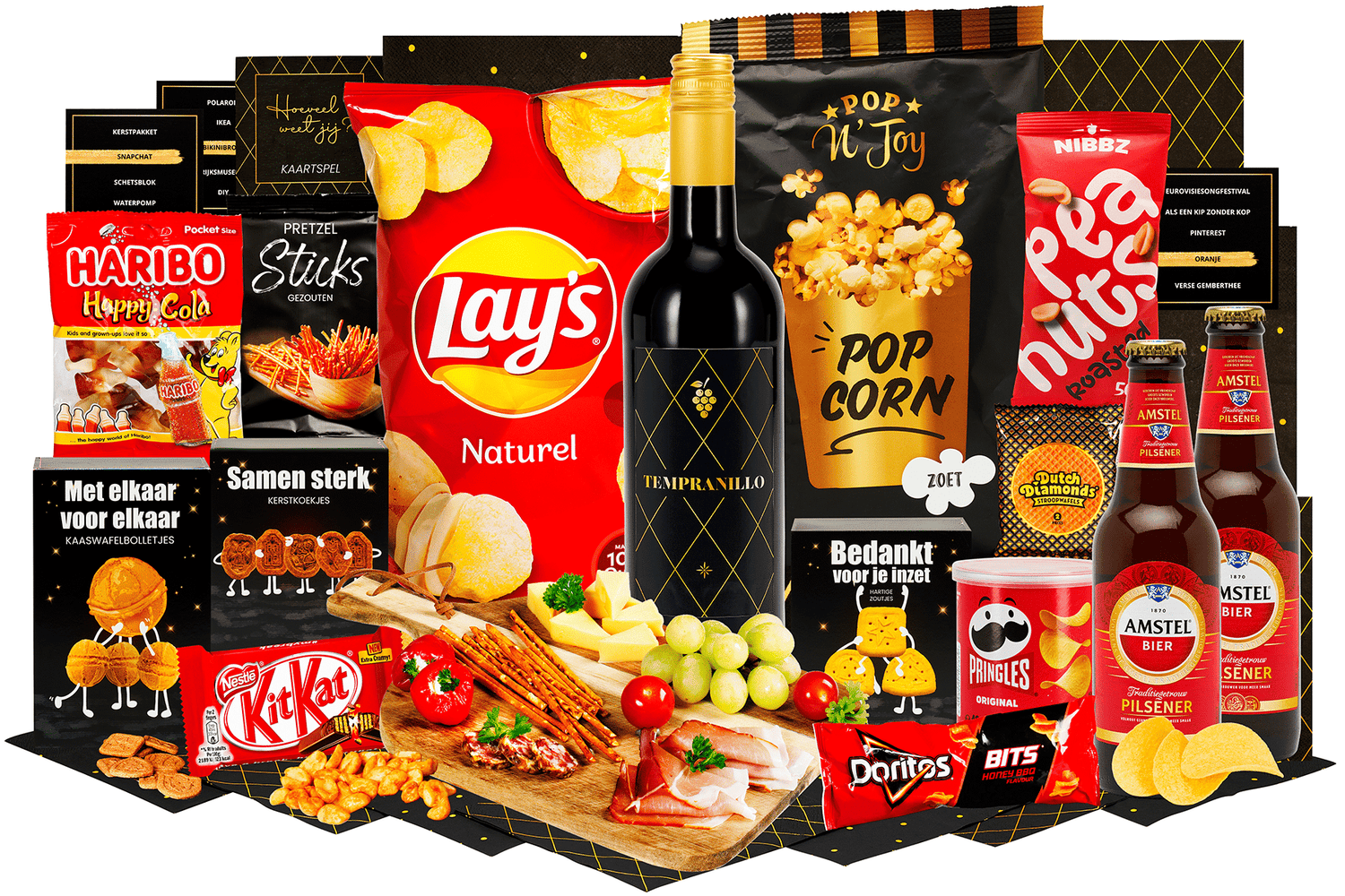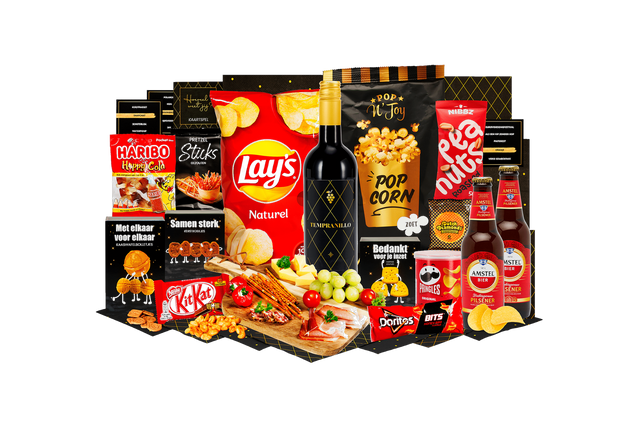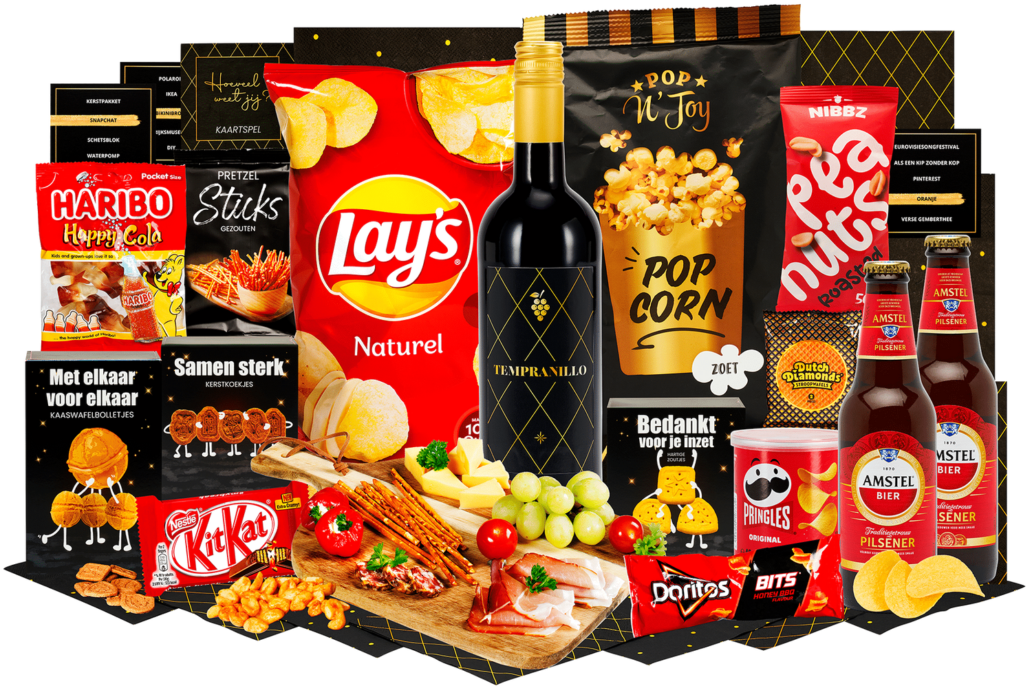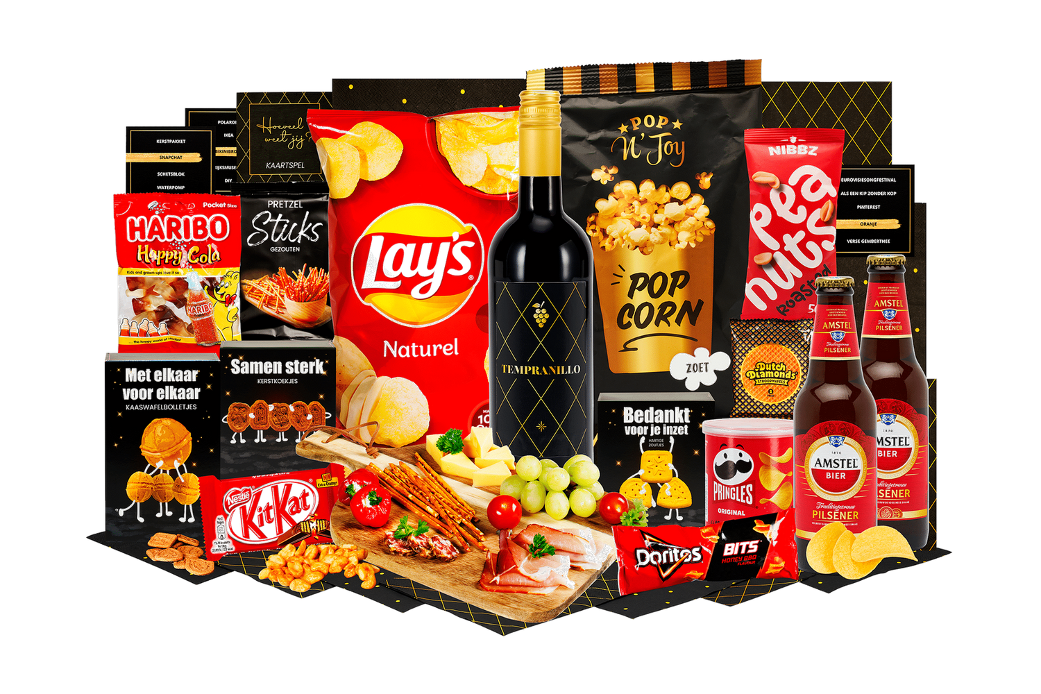 Gezelligheid kent geen tijd. Een zorgvuldig samengestelde geschenkdoos met 18 feestelijke lekkernijen en een acaciahouten snijplank. Ideaal om samen van te genieten: wijn en bier, hartige en zoete snacks en een kaartspel voor extra plezier.