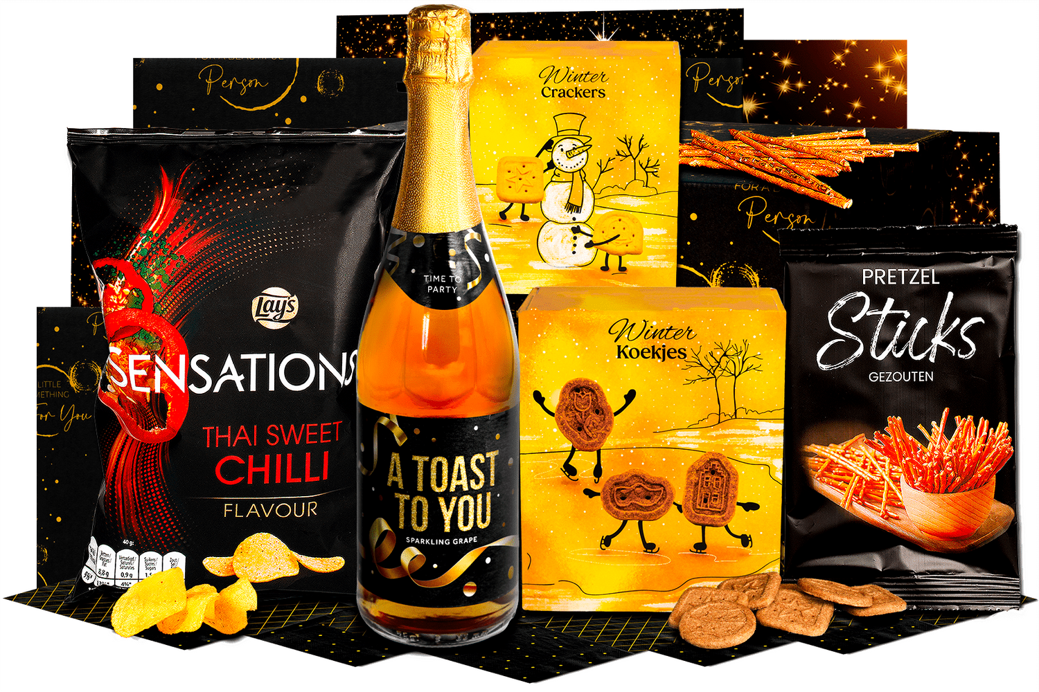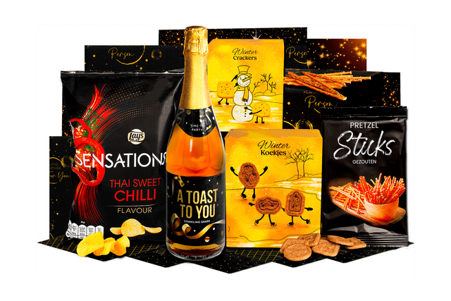 Grote waardering. Een feestelijke cadeauset met heerlijke hartige en zoete lekkernijen en een sprankelend drankje. Perfect als bedankje of kerstgeschenk, direct klaar om te geven.