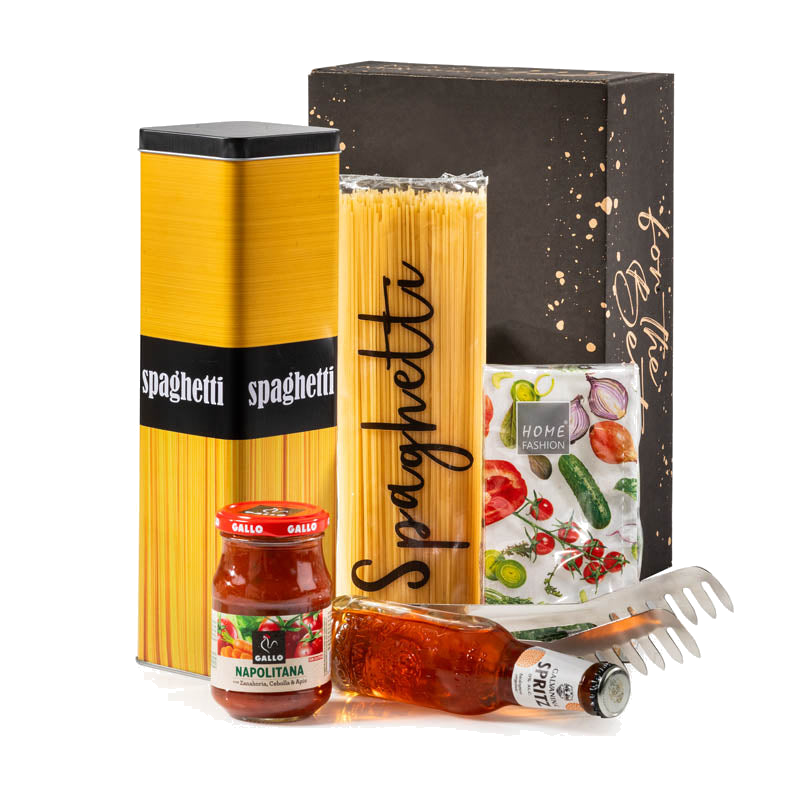 Breng de Italiaanse sfeer eenvoudig naar uw eettafel met deze complete Spaghetti Box. Een doordachte samenstelling van stevige spaghetti en authentieke Napolitana pastasaus vormt de basis, aangevuld met slimme accessoires en een verfrissende biologische alcoholvrije Spritz. De set is stijlvol verpakt in een bijpassende geschenkdoos en is ideaal als attent cadeau of om uzelf te verwennen met een zorgeloos Italiaans avondje uit.