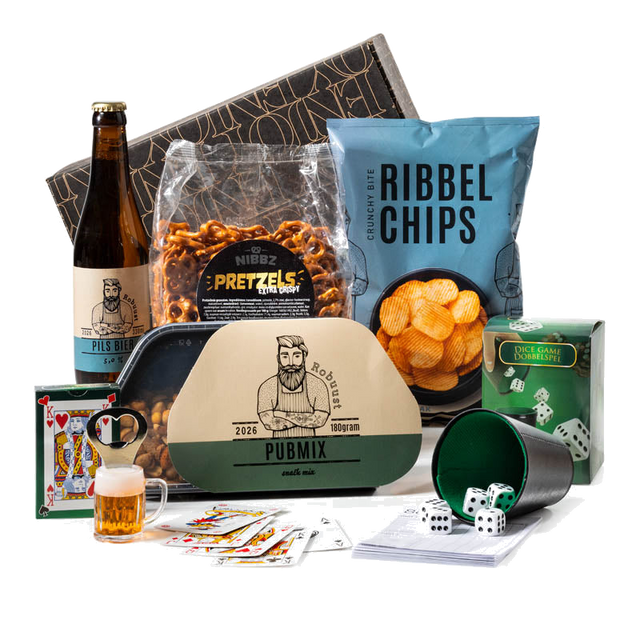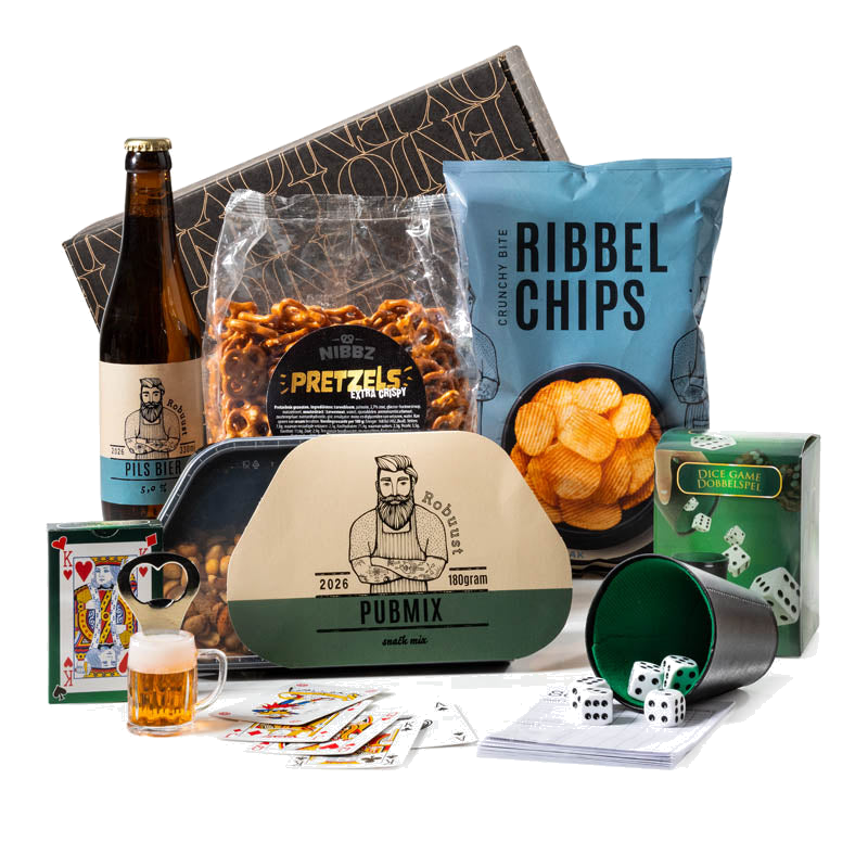 Het pakket is zorgvuldig samengesteld voor een complete borrelervaring: van hartige chips en knapperige pretzels tot een robuust pilsje en slimme accessoires die het samenzijn nóg leuker maken. De producten zitten netjes verpakt in een bijpassende geschenkdoos, klaar om direct te geven.