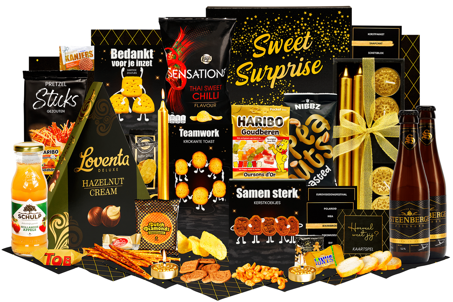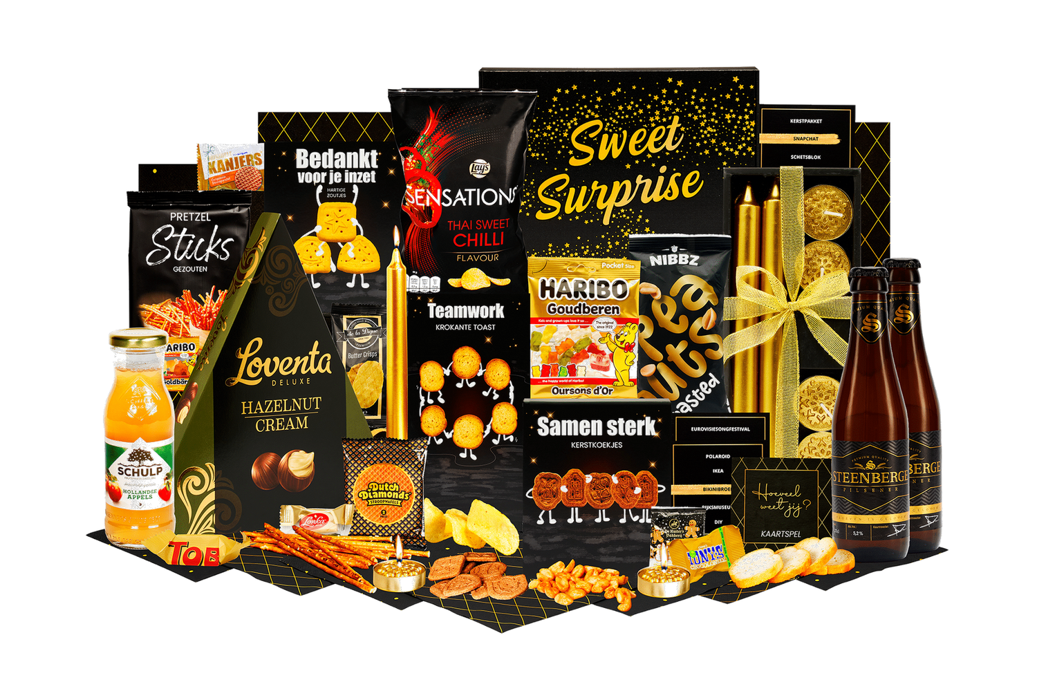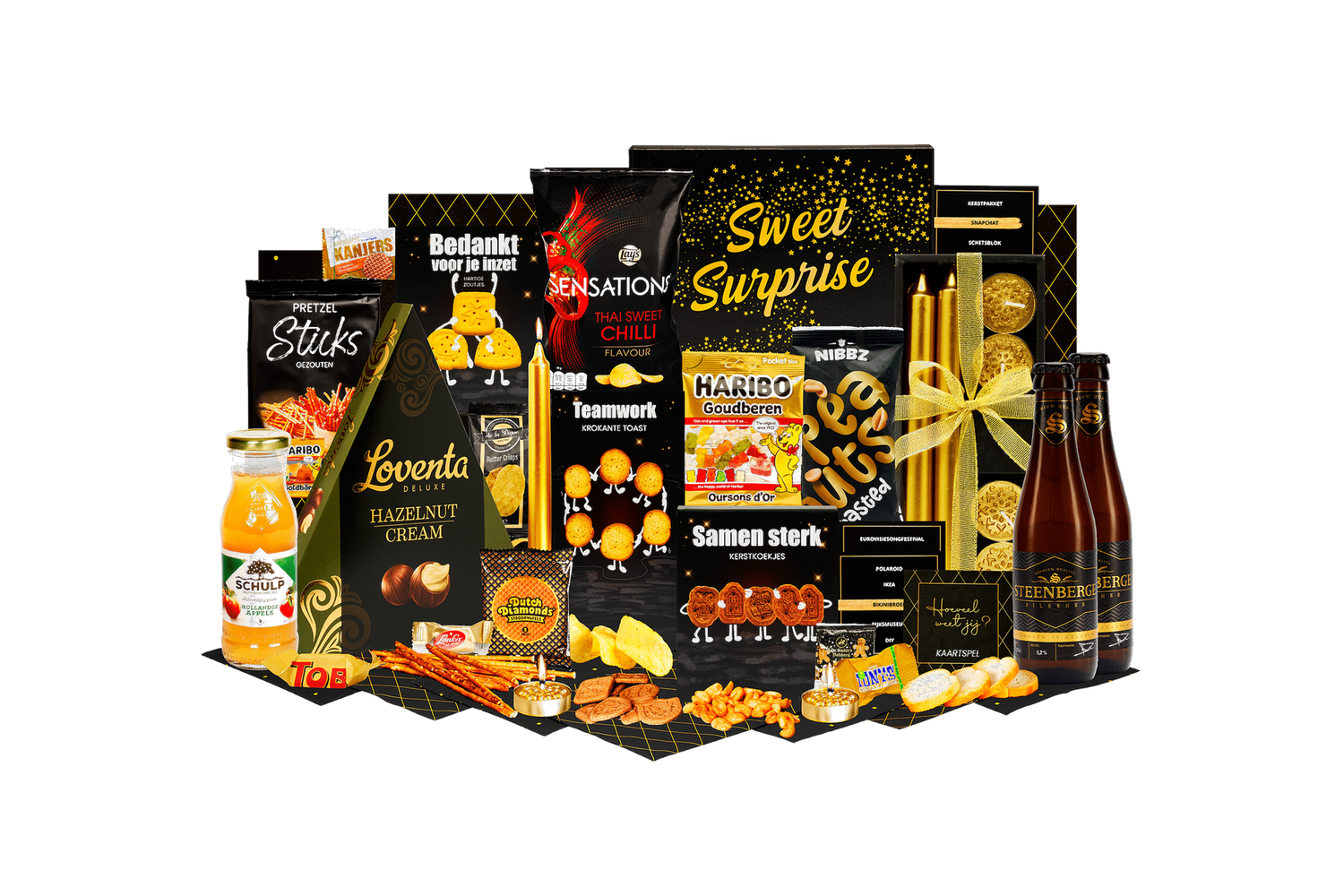 Luxe volume. Een feestelijke geschenkset boordevol smaakvolle lekkernijen en gezellige items. Ideaal als kerstcadeau, relatiegeschenk of voor een feestelijke borrel.