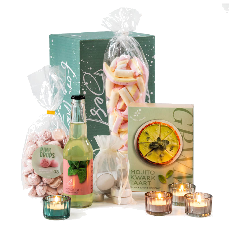Het pakket brengt direct sfeer in huis dankzij de zachte gloed van gekleurde theelichtjes en de frisse, zomerse smaak van een mojito-mocktail. Combineer de snacks voor een gezellige borrel of gebruik de mix voor een verrassende kwarktaart die gegarandeerd in de smaak valt. Iedere component is zorgvuldig gekozen om samen een complete, feestelijke beleving te creëren.