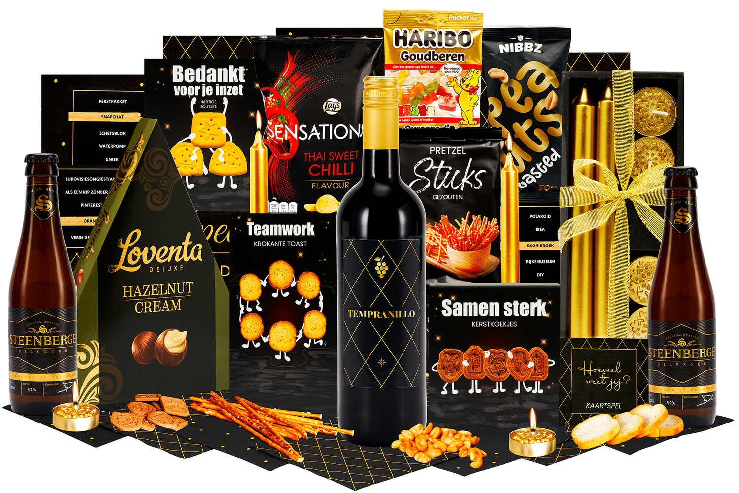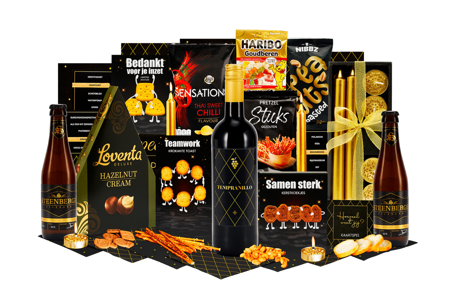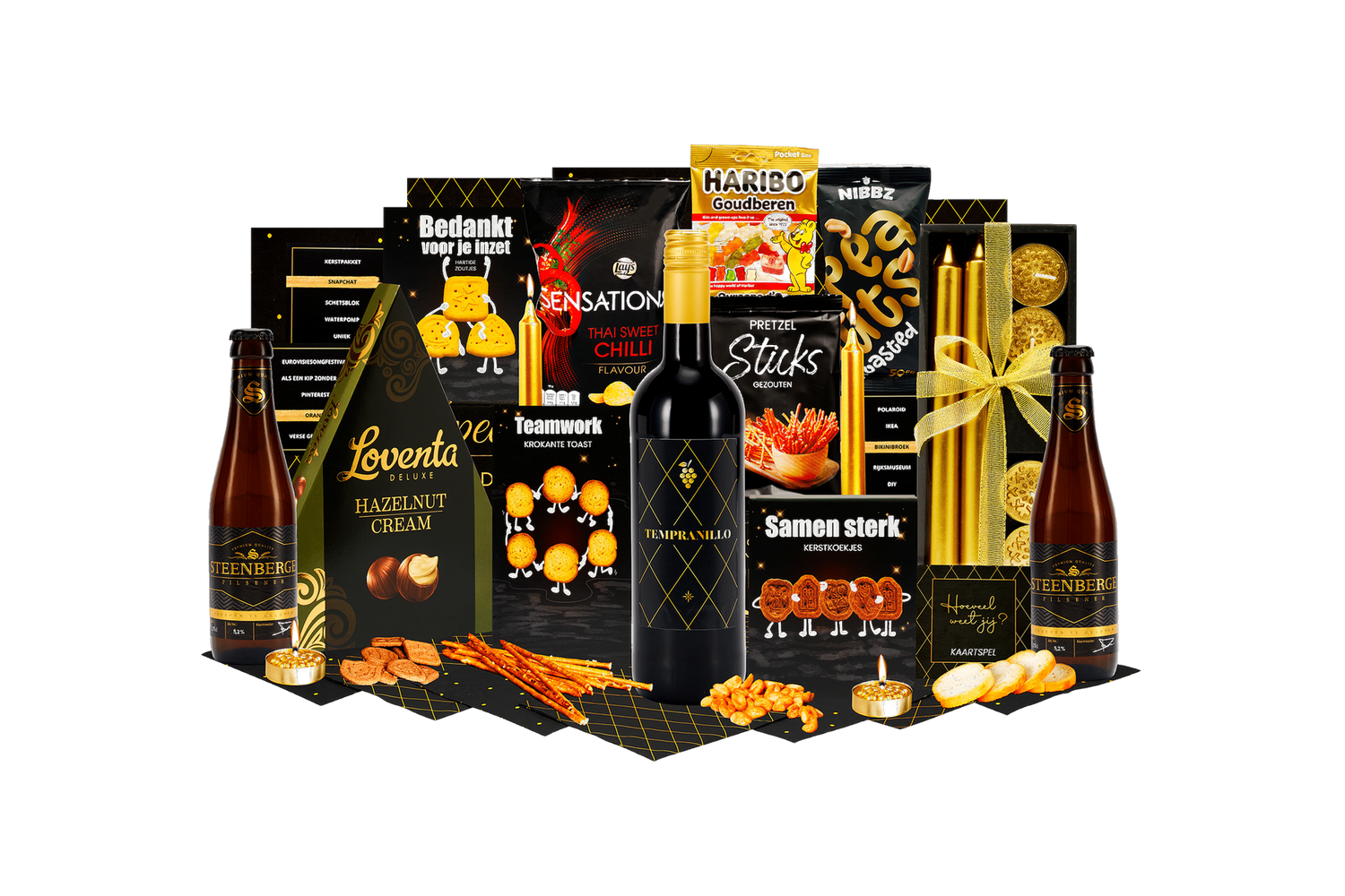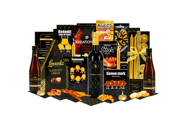 Mooi volume. Een feestelijke borrelbox met een ruime mix van hartige en zoete lekkernijen. Klaar om cadeau te geven of direct te serveren tijdens bijeenkomsten.