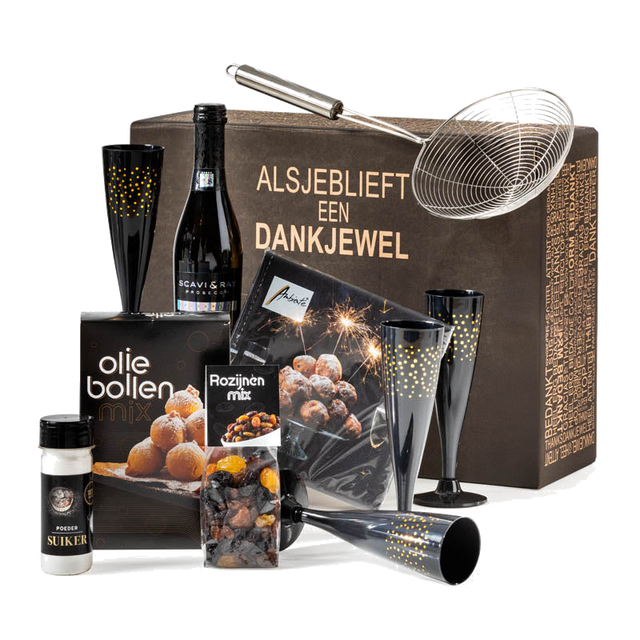 Vier de feestdagen met een smaakvol pakket waarmee je meteen aan de slag kunt: bak zelf verse oliebollen, serveer ze stijlvol en proost met een sprankelend glaasje. Deze compleet samengestelde geschenkset is ideaal als origineel eindejaarscadeau voor familie, vrienden of zakelijke relaties. Perfect voor gezellige wintersessies, borrels en buurtfeesten.
