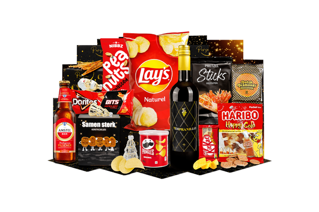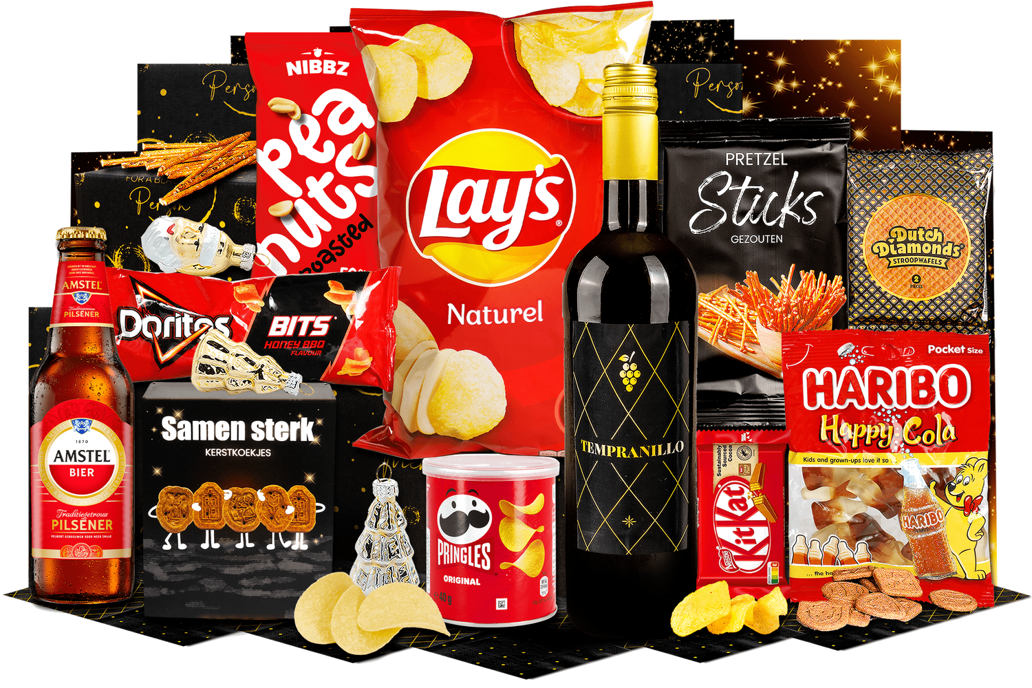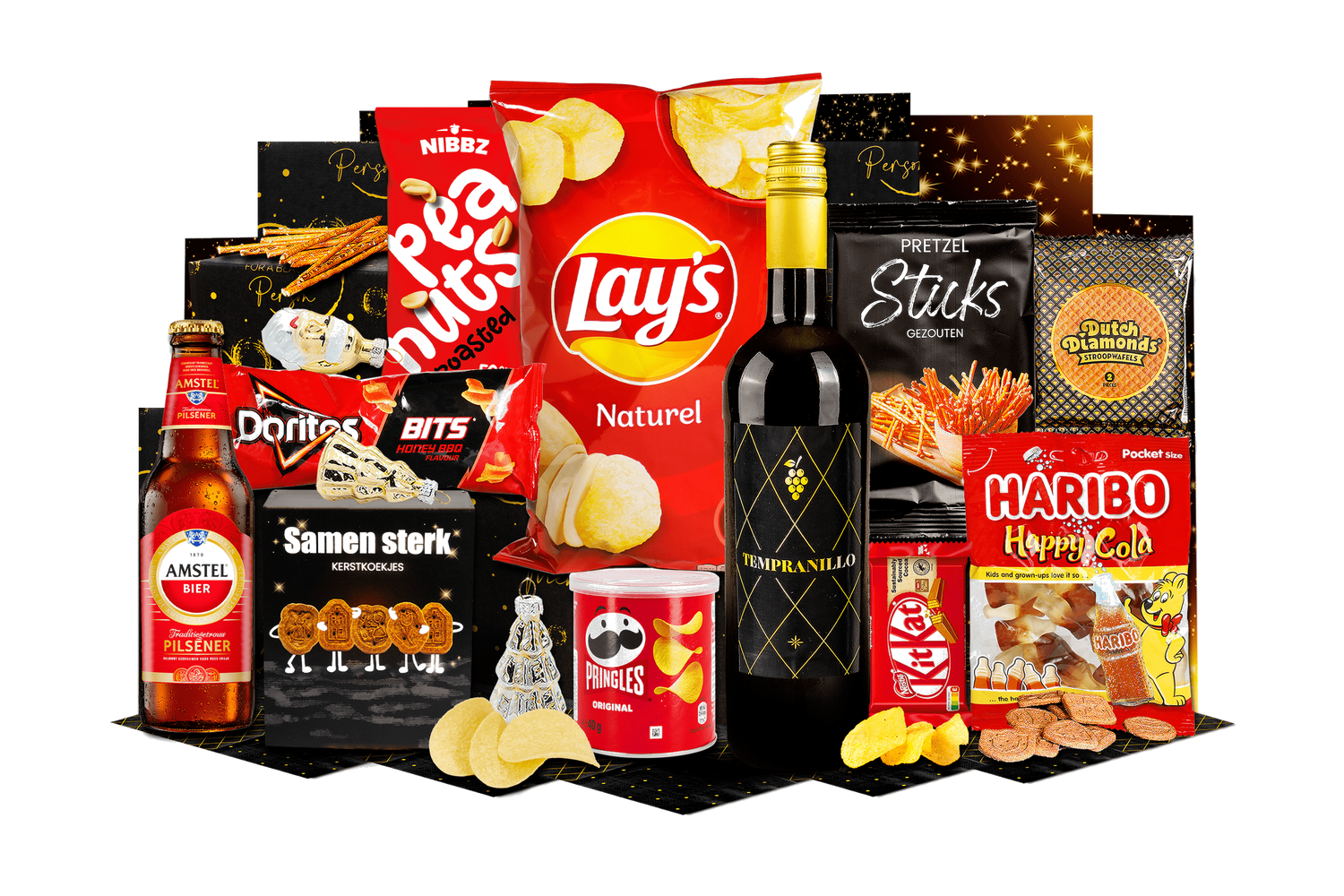 Vertrouwde merken. Een zorgeloos geschenk met herkenbare snacks en dranken. Klaar om direct te geven in een feestelijke doos.