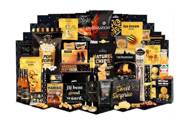 Veel luxe. Een stijlvolle en volle cadeaubox boordevol lekkernijen en borrelproducten. Perfect als relatiegeschenk of voor een feestelijke borrel thuis.