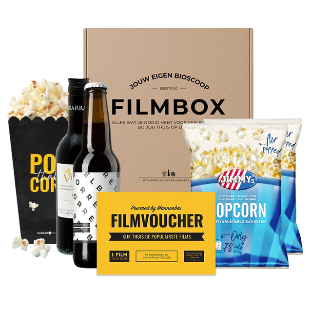 Geef een avond vol gemak en entertainment met dit luxe filmpakket — perfect als kerstcadeau, relatiegeschenk of persoonlijke verwennerij. Alles wat je nodig hebt voor een gezellige filmavond wordt stijlvol gepresenteerd in een stevige cadeauverpakking: drinken, popcorn, een handige popcornbeker en een digitale filmvoucher waarmee de ontvanger zelf een film uitkiest. Door de combinatie van een direct bruikbare voucher en smakelijke lekkernijen is dit pakket een veilige keuze voor een brede doelgroep.