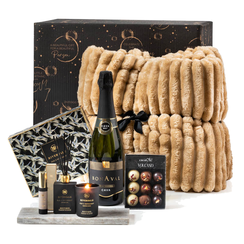 Trakteer uzelf of een dierbare op een moment van pure luxe met deze zorgvuldig samengestelde cadeaubox. Het zachte, warme plaid in een tijdloze beige tint nodigt uit om weg te kruipen met een goed boek of film. Het elegante marmeren plateau voegt een subtiel designaccent toe aan elk interieur en is perfect om hapjes of kaarsen stijlvol te presenteren. Verfijn de sfeer met de luxe Riverdale Olivia geoset in de verfijnde geur Oud & Bergamot en hef het glas op speciale momenten met een fijne fles Bonaval Cava Brut. Een doos vol comfort, smaak en design — ideaal als cadeau voor huiselijke verwennerij.