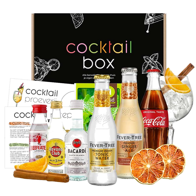 Trakteer jezelf of iemand anders op een feestelijke cocktailervaring met het luxe Cocktail Kerstpakket. Perfect voor liefhebbers van verfijnde drankjes of als origineel cadeau tijdens de feestdagen. Dit doe-het-zelf pakket bevat alle benodigde ingrediënten en heldere recepten om thuis drie heerlijke cocktails te maken: Cuba Libre, Mojito Ginger Ale en Gin Tonic. Alles is kant-en-klaar voorbereid; je hoeft alleen nog een glas en ijsblokjes toe te voegen. Proost op een smaakvol samenzijn!