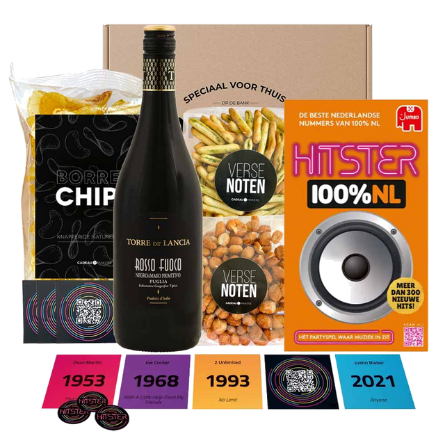 Verras je familie deze feestdagen met een kerstpakket dat draait om gezelligheid, muziek en heerlijke hapjes. Dit spelletjes kerstpakket voor het gezin combineert het populaire muziekspeelletje Hitster 100% NL met zorgvuldig geselecteerde snacks en een volle rode wijn. Perfect als familie kerstcadeau om samen te zingen, te lachen en herinneringen te maken.