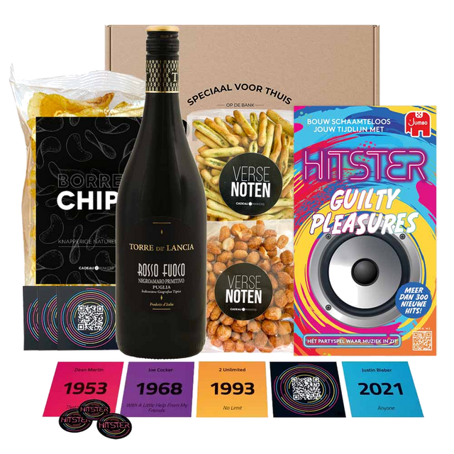 Tijdens het spelen geniet je van een selectie verfijnde snacks en een smaakvolle Italiaanse rode wijn. Alle artikelen zijn stijlvol verpakt in een luxe borrelbox, zodat het pakket meteen als cadeau klaar is. Een complete beleving: entertainment, smaak en sfeer in één.