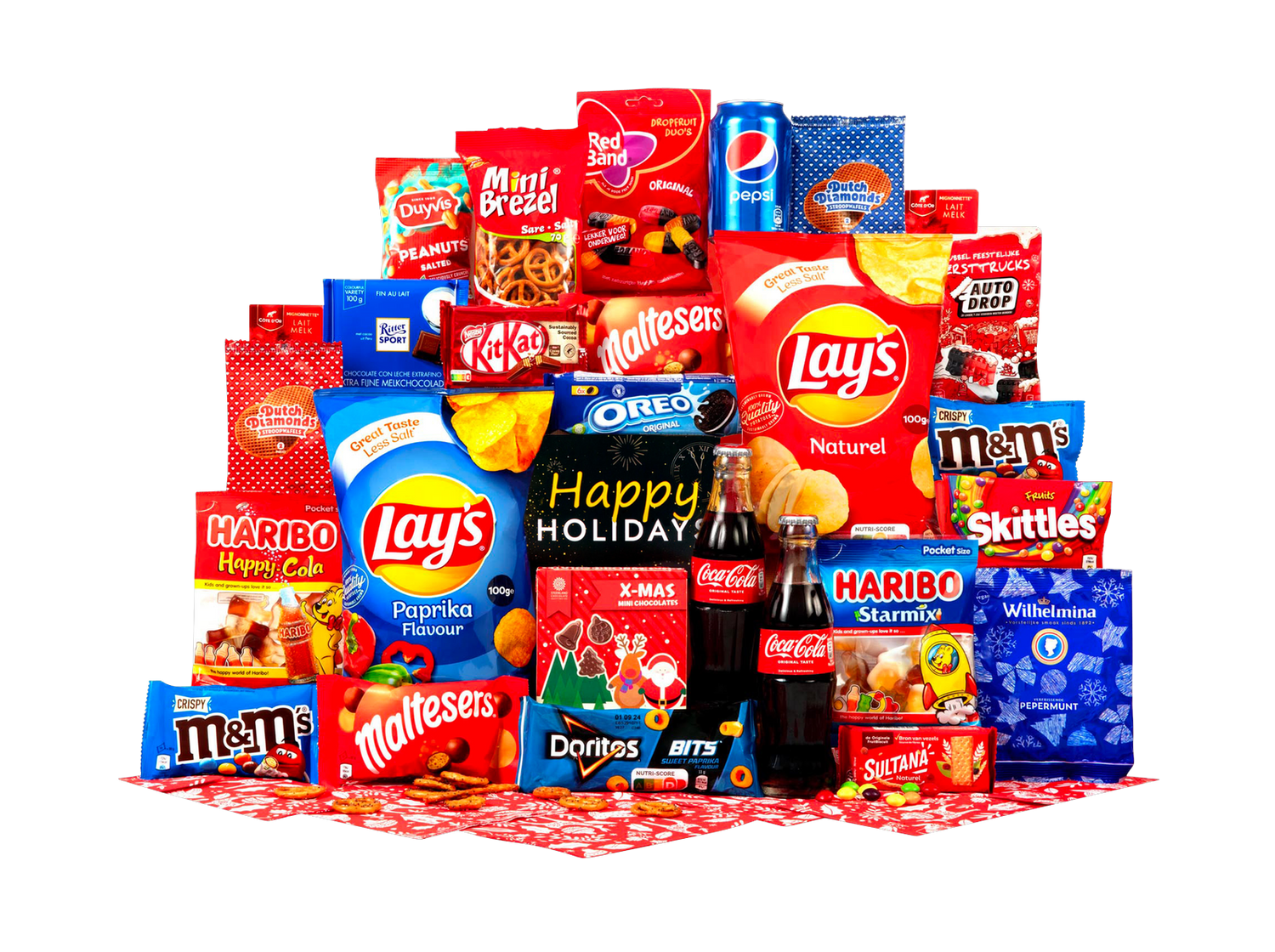 Verras vrienden, familie of collega’s met de Feestelijke Snackbox Deluxe, een zorgvuldig samengestelde geschenkdoos vol bekende favorieten. Deze feestelijke box combineert geliefde chocolade, knapperige chips, frisse frisdrank en klassieke drop- en koekjeslekkernijen. Perfect als cadeau voor de feestdagen, als relatiegeschenk of als verrassingspakket voor thuisbezorging. De box is aantrekkelijk verpakt en voorzien van een vrolijke kaart met de tekst Happy Holidays, zodat u meteen klaar bent om iemand blij te maken.