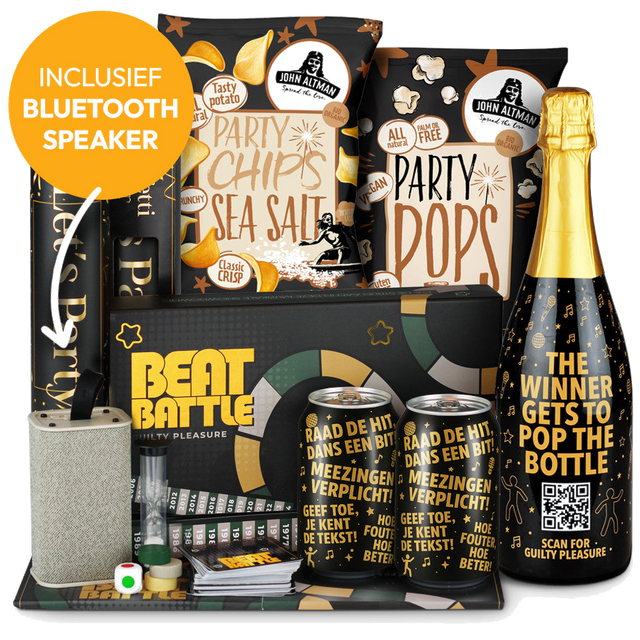Geniet ondertussen van twee frisse biertjes, knapperige seasalt chips en luchtige party popcorn. Voor de ultieme feeststemming is er een confettikanon én een handige draadloze Bluetooth speaker toegevoegd. Dit veelzijdige pakket heeft alles in zich voor een avond vol gezelligheid. Een origineel en verrassend geschenk voor personeel, collega’s of vrienden. Inhoud: 8 artikelen; 1x Movisa Cava - 0,75l; 1x Draadloze Bluetooth speaker; 1x Bordspel BEAT BATTLE; 1x Let's Party Confettie kanon; 2x Beat Battle Pilsener - 33cl; 1x John Altman Bio Organic Seasalt Popcorn - 60gr; 1x John Altman Vegan Sweet Potato Sea Salt - 90gr; 1x Luxe geschenkverpakking