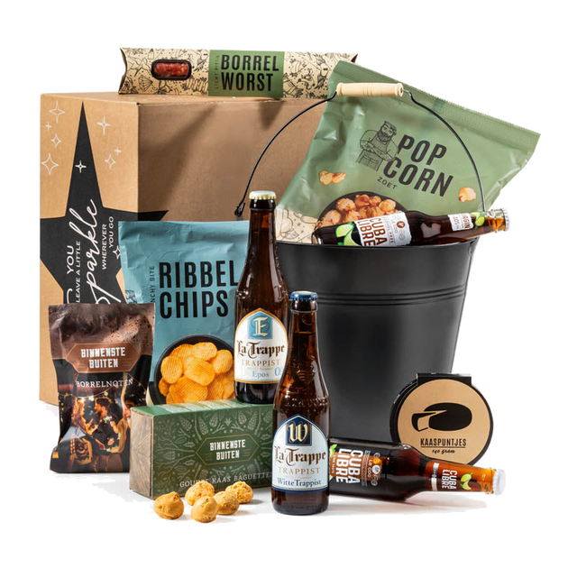 Verras de borrelliefhebber met dit stijlvolle en smaakvolle kerstpakket: een stoer cadeau dat meteen uitnodigt tot gezelligheid. De zwarte metalen emmer dient niet alleen als fraaie presentatie, maar ook als praktische bier- en cocktailkoeler. Met een mix van karaktervolle speciaalbieren, verfrissende (mock)cocktails en stevige, hartige snacks is dit pakket perfect voor een ontspannen avond met vrienden of familie.