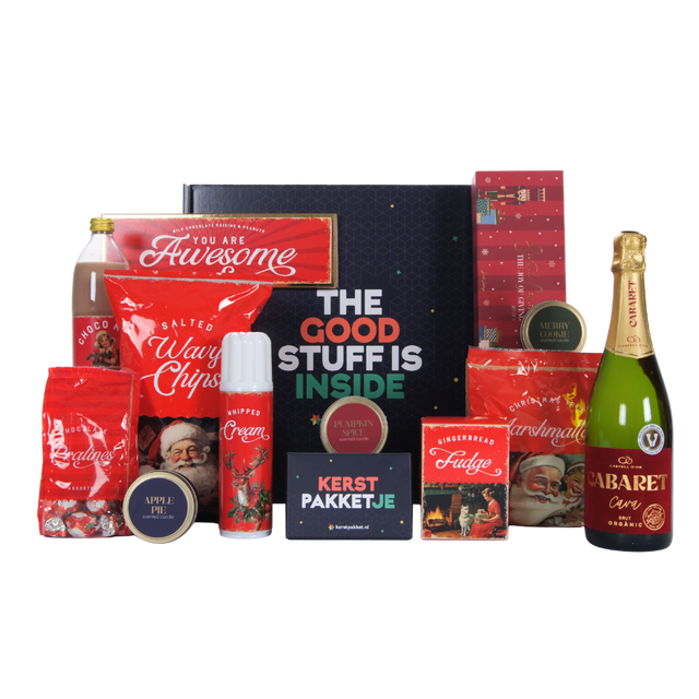 Geniet van heerlijke Vintage Christmas bonbons in kerstmanvorm (100 g), romige chocomelk (500 ml) en zachte marshmallows in boompjesvorm (125 g). Voor de liefhebber van hartige en zoete snacks is er fudge speculaas (110 g), een royale melkchocoladereep XXL met rozijnen en pinda (225 g) en krokante ribbelchips zout (150 g). Een spuitbus slagroom (250 g) maakt de warme chocolademelk helemaal af.